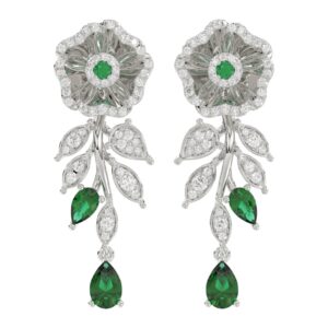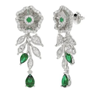 18K WHITE GOLD 2CT ROUND/PEAR DIAMOND LADIES EARRINGS(COLOR STONE GREEN EMERALD ROUND DIAMOND 1/15CT / PEAR DIAMOND 1 3/8CT)