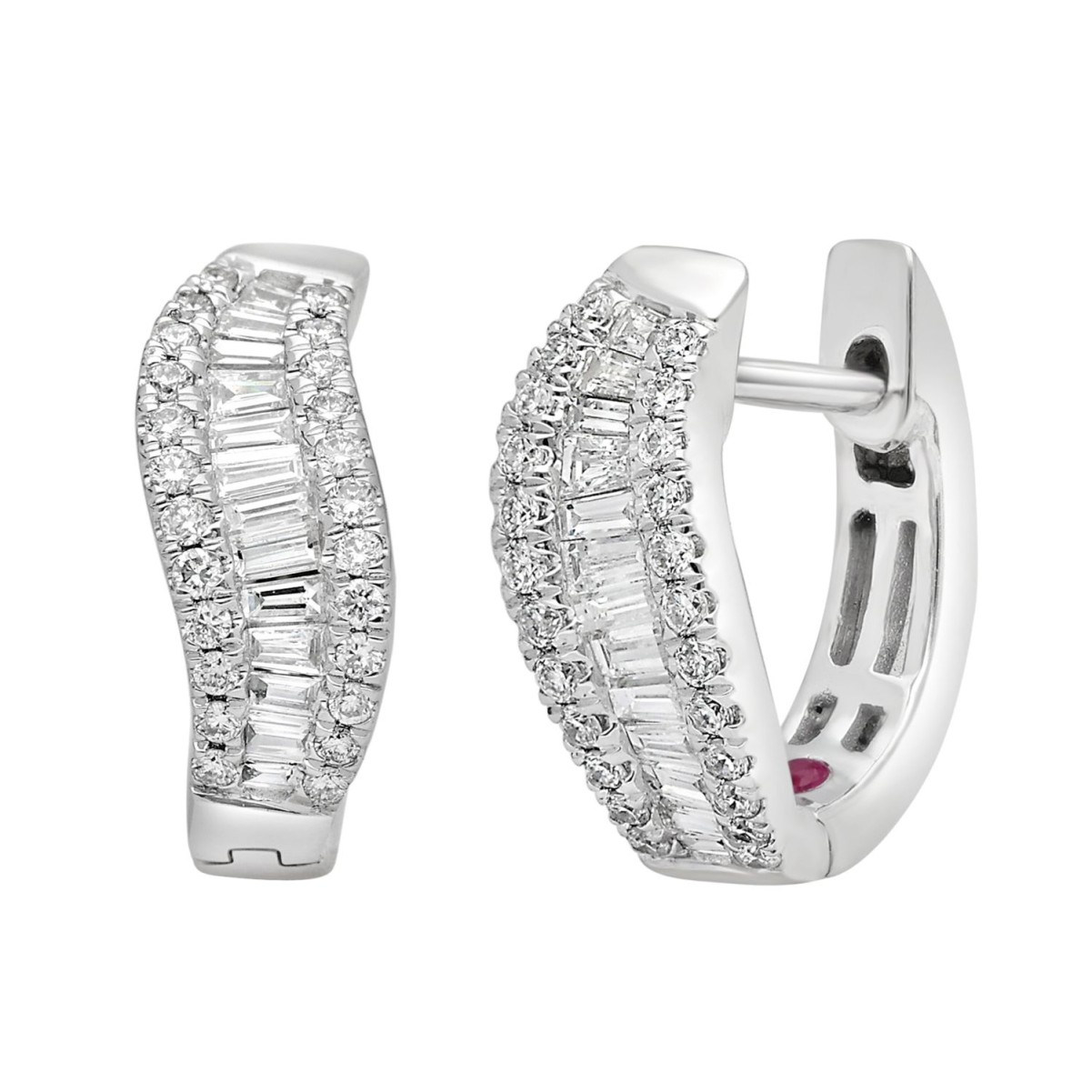 14K WHITE GOLD 1/2CT ROUND/BAGUETTE DIAMOND LADIES HOOPS EARRINGS