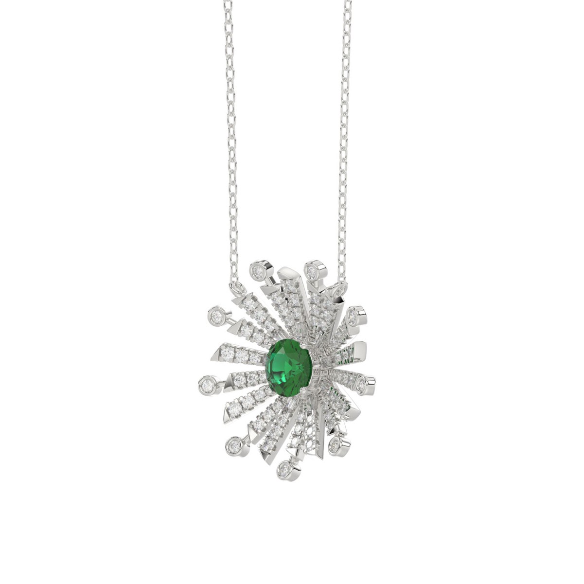 18K WHITE GOLD 1 1/2CT ROUND/BAGUETTE DIAMOND LADIES NECKLACE(COLOR STONE EMERALD/ROUND DIAMOND 7/8CT)
