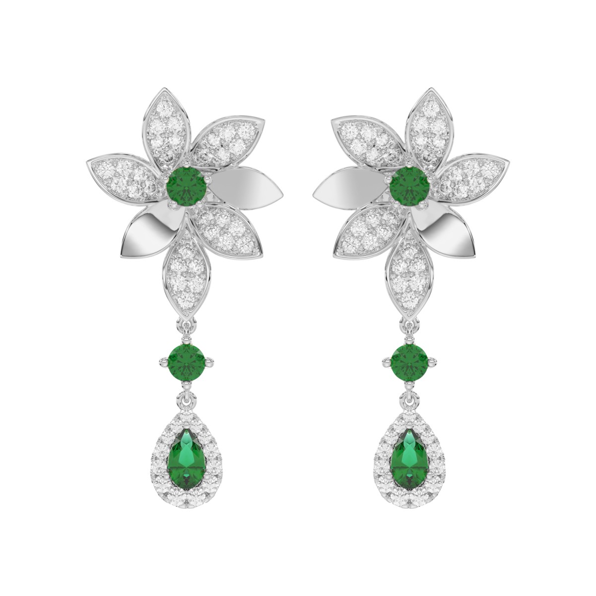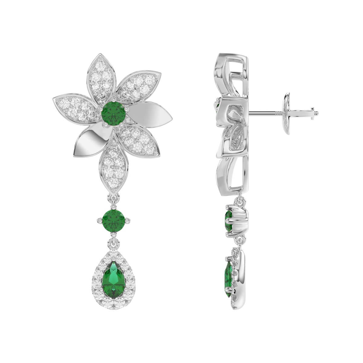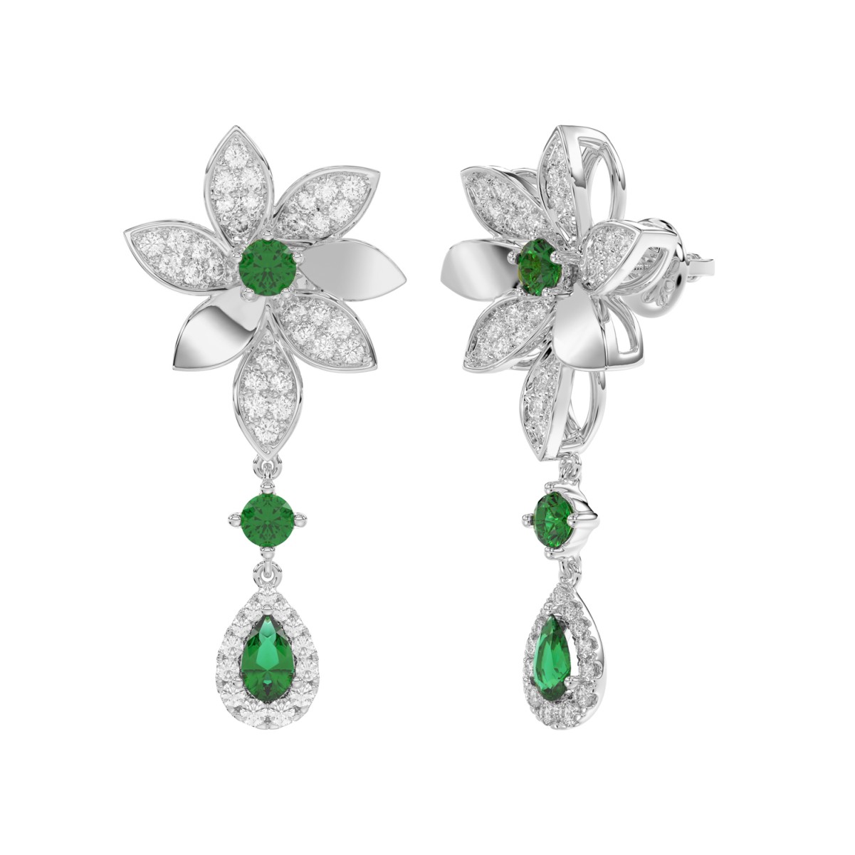 18K WHITE GOLD 1 3/4CT ROUND/PEAR DIAMOND LADIES EARRINGS(COLOR STONE GREEN EMERALD DIAMOND 1/2CT/PEAR DIAMOND 1/2CT)