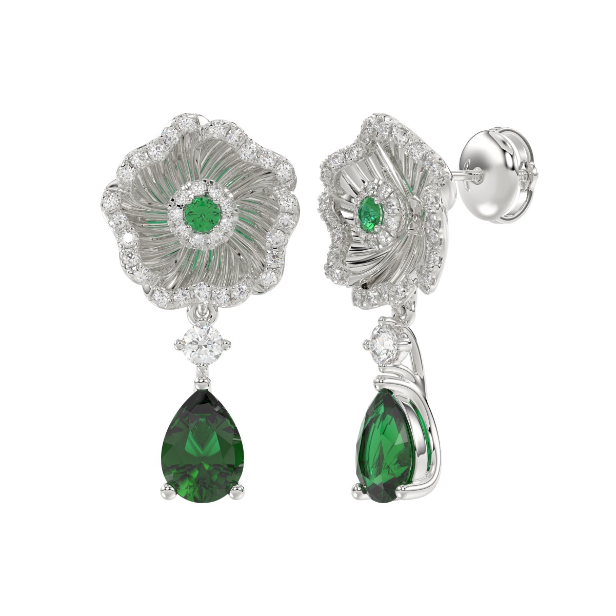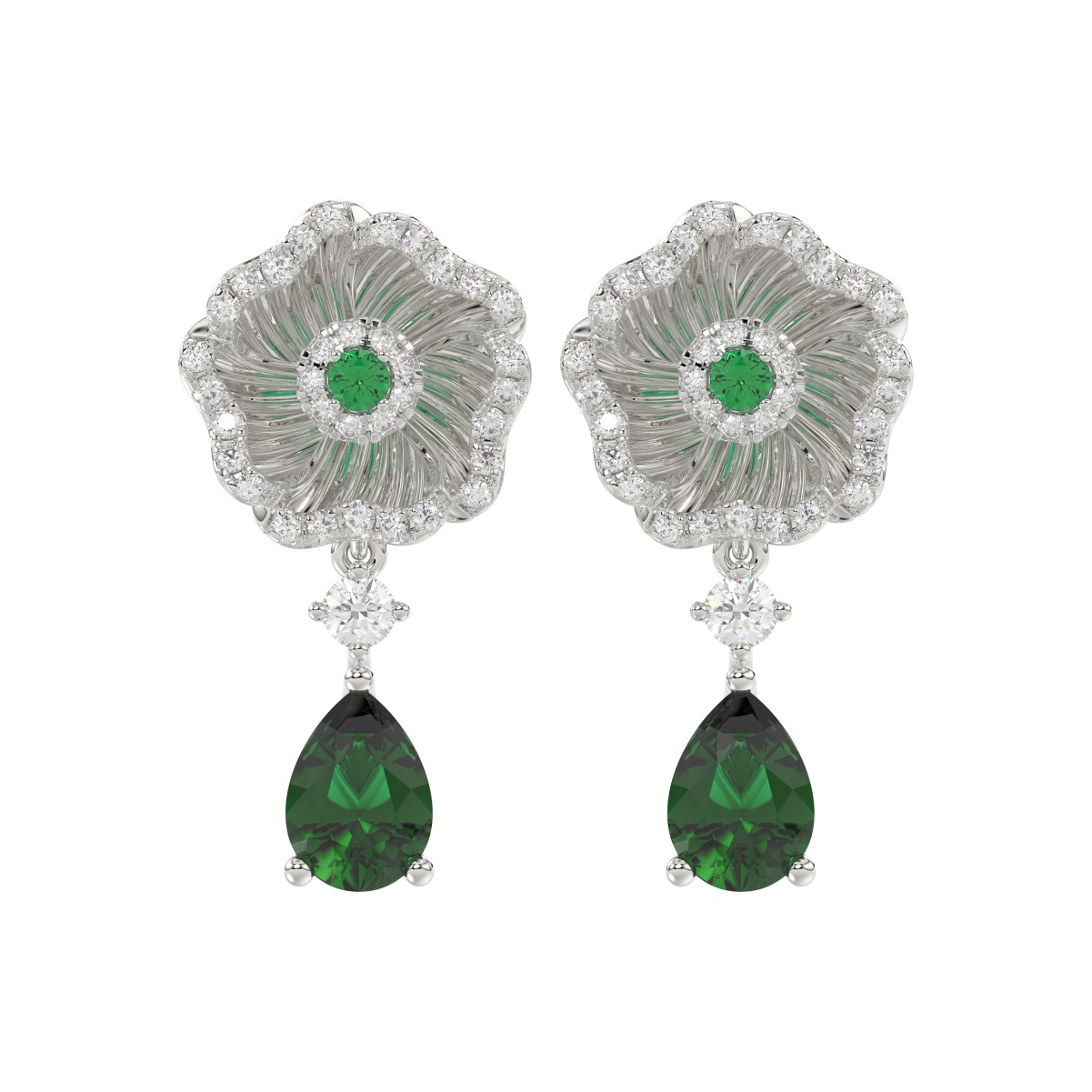18K WHITE GOLD 2CT ROUND/PEAR DIAMOND LADIES EARRINGS(COLOR STONE GREEN EMERALD ROUND DIAMOND 1/15CT / PEAR DIAMOND 1 3/8CT)