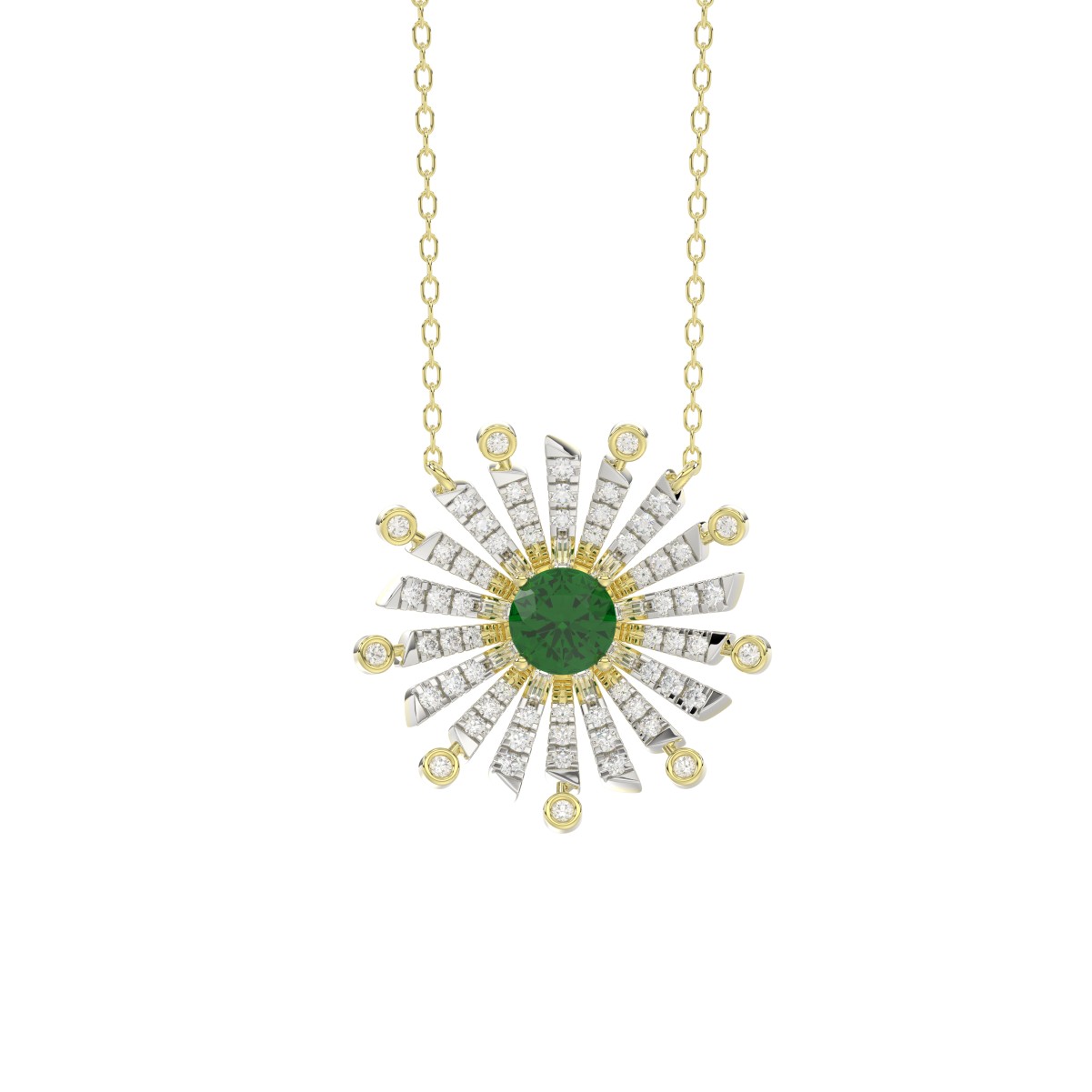 18K YELLOW GOLD 1 1/2CT ROUND/BAGUETTE DIAMOND LADIES NECKLACE(COLOR STONE EMERALD/ROUND DIAMOND 7/8CT)