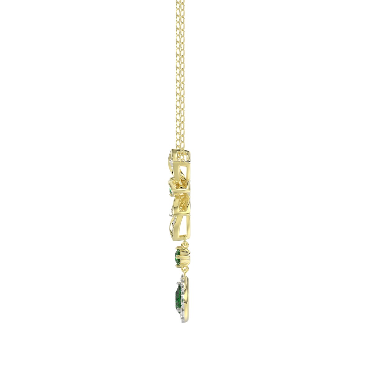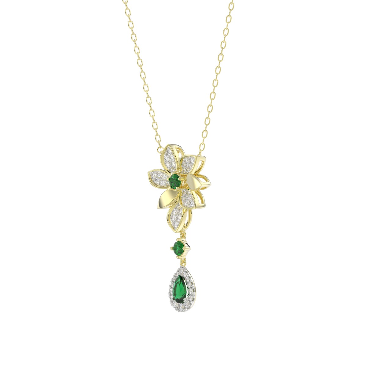 18K YELLOW GOLD 1 1/6CT ROUND/EMERALD/PEAR DIAMOND LADIES NECKLACE(COLOR STONE GREEN EMERALD ROUND DIAMOND 1/4CT/PEAR DIAMOND 1/2CT)