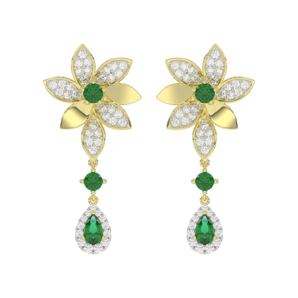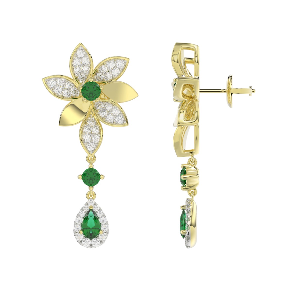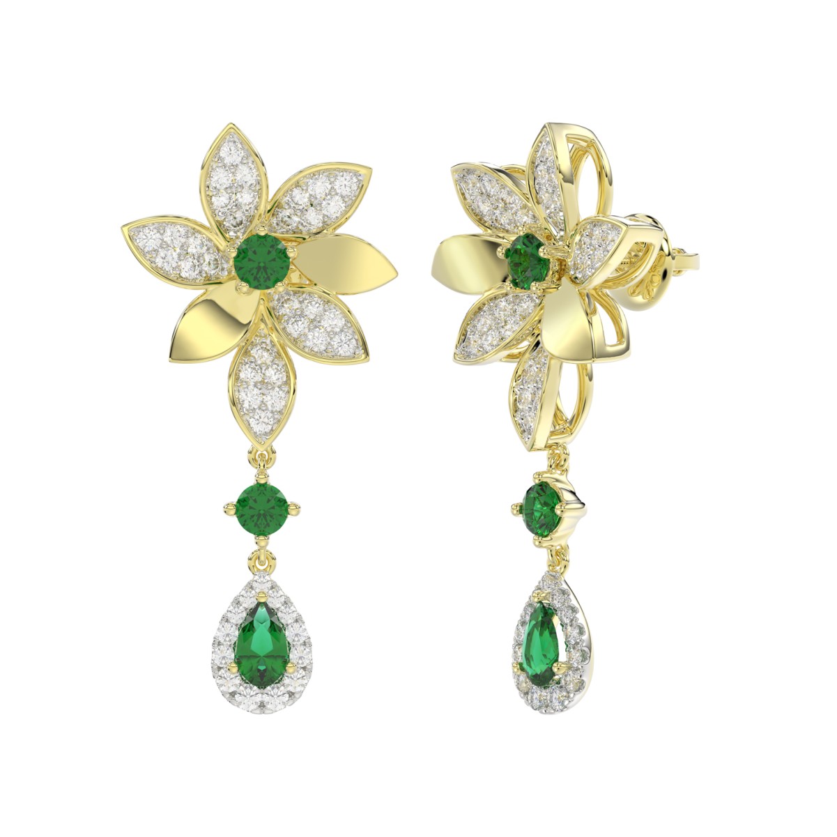 18K YELLOW GOLD 1 3/4CT ROUND/PEAR DIAMOND LADIES EARRINGS(COLOR STONE GREEN EMERALD DIAMOND 1/2CT/PEAR DIAMOND 1/2CT)