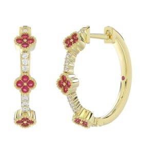 18K YELLOW GOLD 1/4CT ROUND DIAMOND LADIES HOOP EARRINGS(COLOR STONE RUBY DIAMOND 1/10CT)